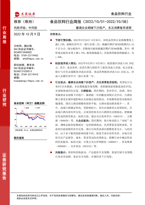 【东莞证券】【20221009】20221009-东莞证券-食品饮料行业周报:酱酒企业相继下沙投产,关注消费复苏进程-13页