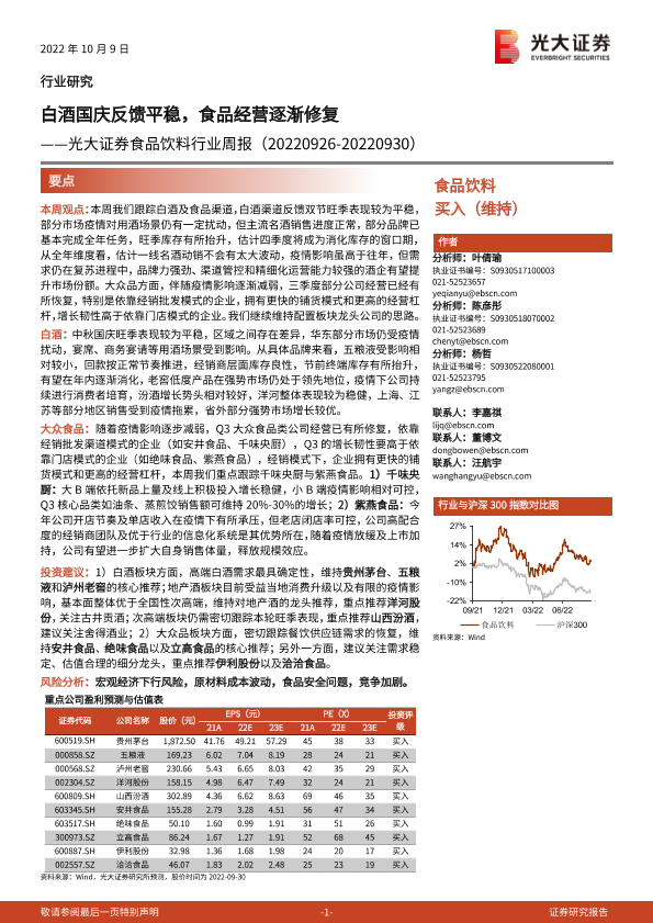 【光大证券】【20221009】20221009-光大证券-食品饮料行业周报:白酒国庆反馈平稳,食品经营逐渐修复-10页