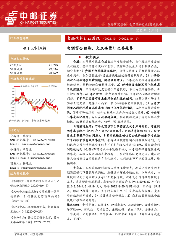 【中邮证券】【20221016】20221016-中邮证券-食品饮料行业周报:白酒符合预期,大众品紧盯改善趋势-19页
