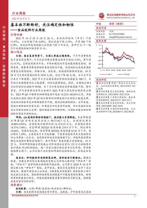 【东亚前海证券】【20221031】20221031-东亚前海证券-食品饮料行业周报:基本面不断转好,关注确定性和韧性-20页