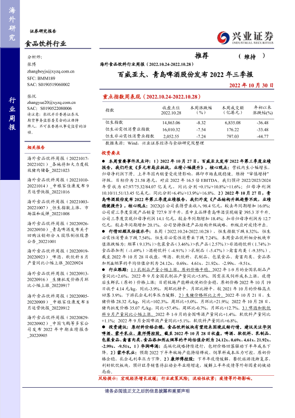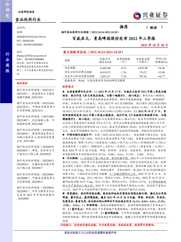 【兴业证券】【20221030】海外食品饮料行业周报(2022.10.24-2022.10.28):百威亚太、青岛啤酒股份发布2022年三季报-11页