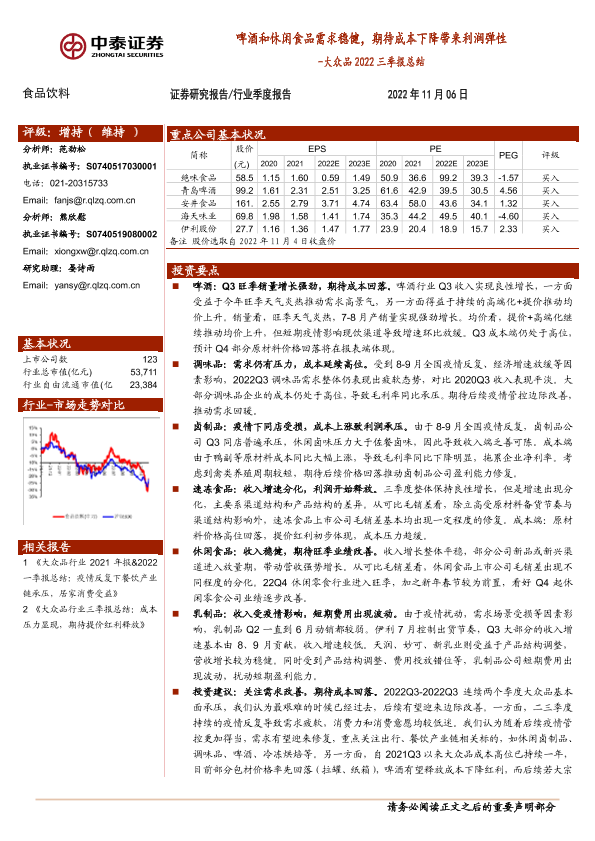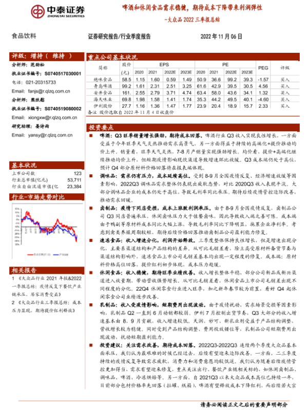 【中泰证券】【20221106】食品饮料:大众品2022三季报总结-啤酒和休闲食品需求稳健,期待成本下降带来利润弹性-17页