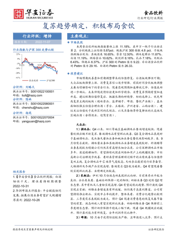 【华安证券】【20221107】20221107-华安证券-食品饮料行业周报:复苏趋势确定,积极布局食饮-27页