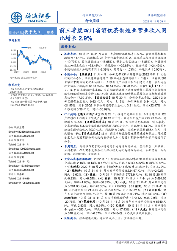 【海通证券】【20221109】20221109-海通证券-食品行业周报:前三季度四川省酒饮茶制造业营业收入同比增长2.9%-16页