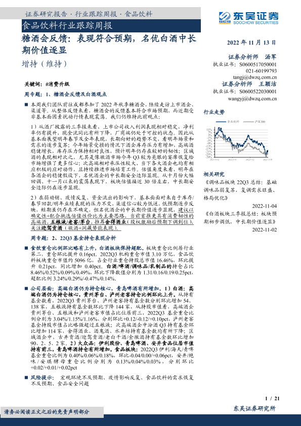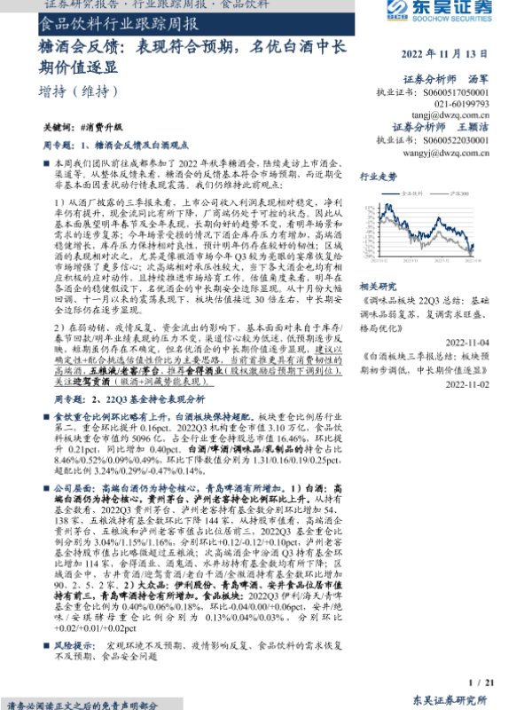 【东吴证券】【20221113】食品饮料行业跟踪周报:糖酒会反馈:表现符合预期,名优白酒中长期价值逐显-21页