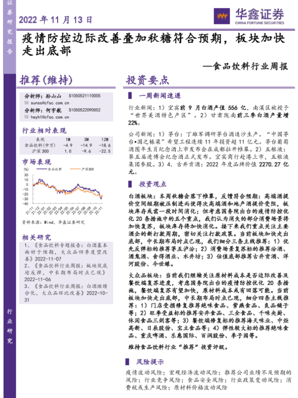 【华鑫证券】【20221113】20221113-华鑫证券-食品饮料行业周报:疫情防控边际改善叠加秋糖符合预期,板块加快走出底部-20页