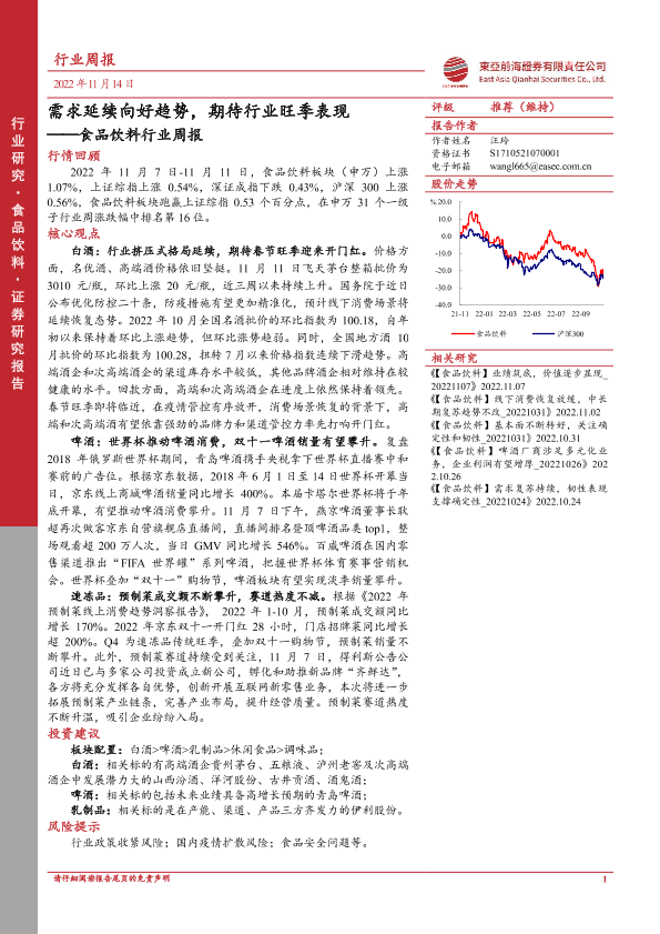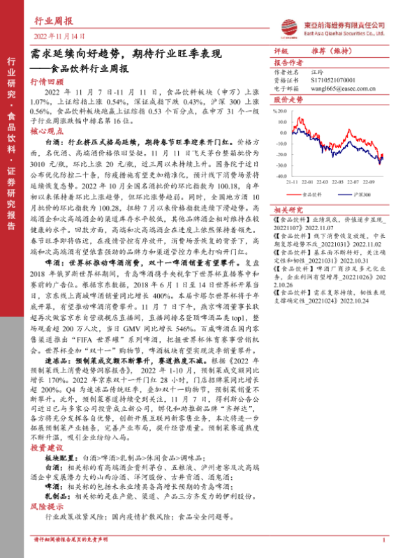 【东亚前海证券】【20221114】20221114-东亚前海证券-食品饮料行业周报:需求延续向好趋势,期待行业旺季表现-21页