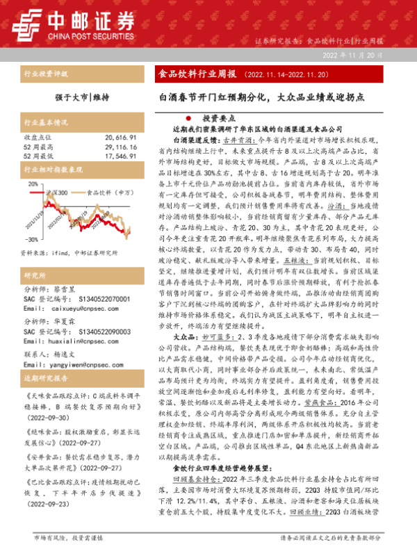 【中邮证券】【20221120】20221120-中邮证券-食品饮料行业周报:白酒春节开门红预期分化,大众品业绩或迎拐点-21页