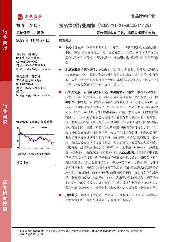 【东莞证券】【20221127】20221127-东莞证券-食品饮料行业周报:茅台酒营收破千亿,啤酒需求环比增加-15页
