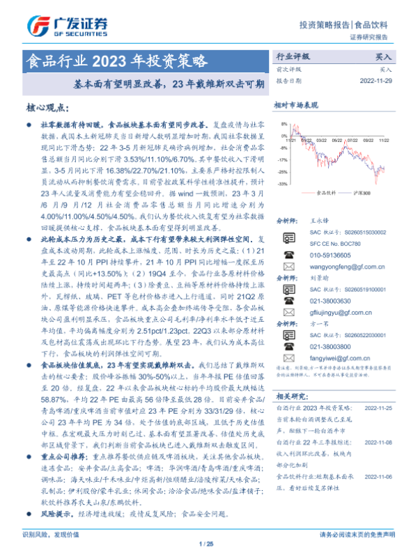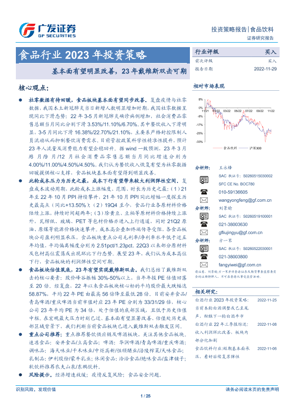 【广发证券】【20221129】食品行业2023年投资策略:基本面有望明显改善,23年戴维斯双击可期-25页