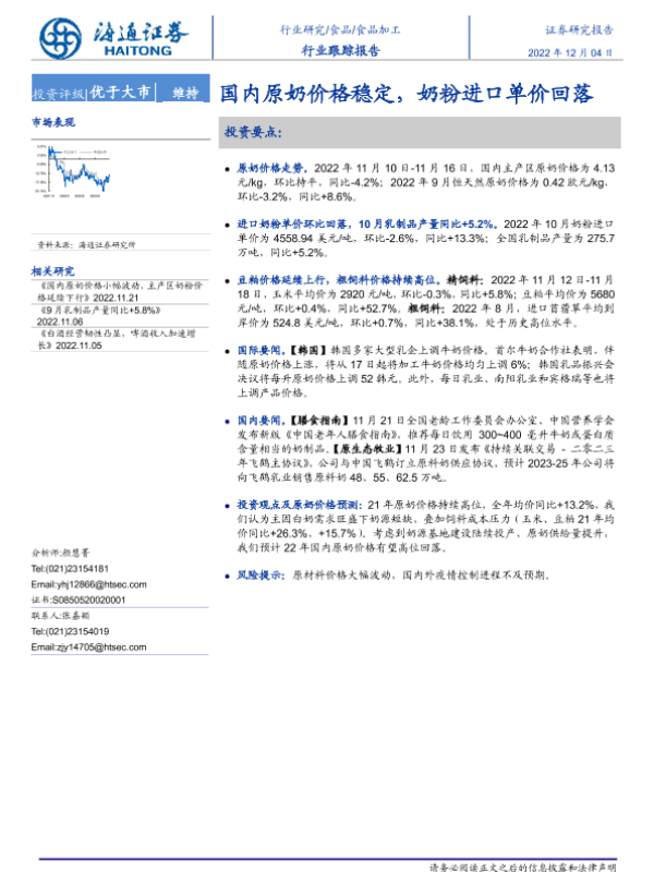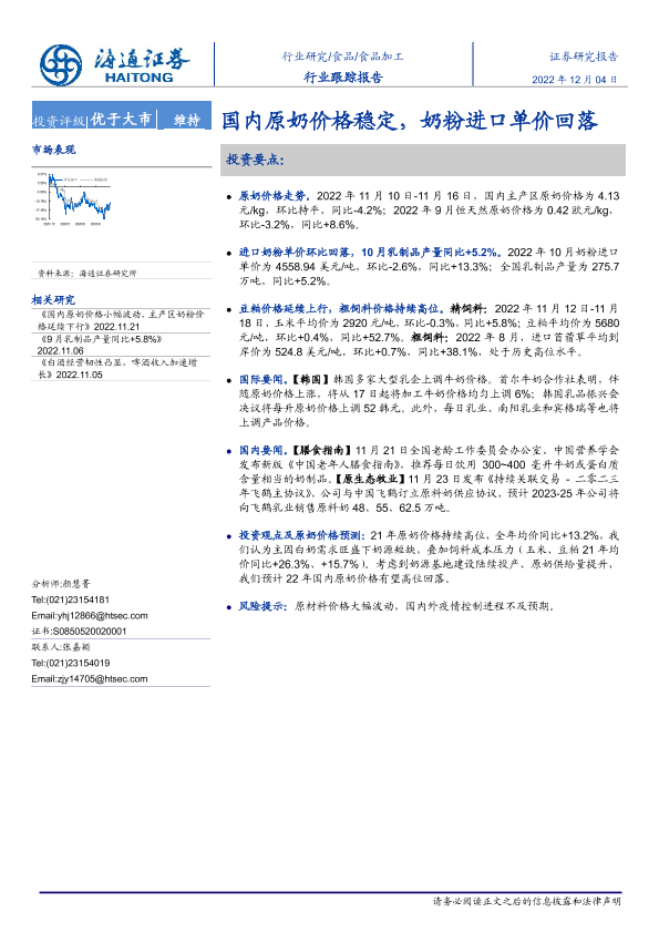 【海通证券】【20221204】食品加工行业跟踪报告:国内原奶价格稳定,奶粉进口单价回落-10页