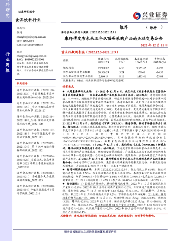 【兴业证券】【20221211】海外食品饮料行业周报(2022.12.5-2022.12.9)康师傅发布未来三年从顶峰采购产品的关联交易公告-13页