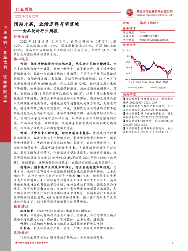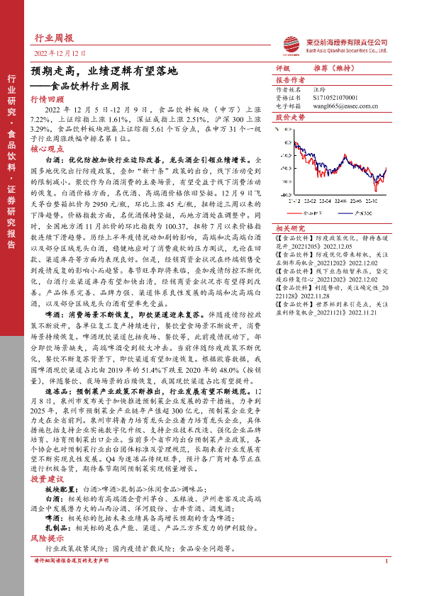 【东亚前海证券】【20221212】20221212-东亚前海证券-食品饮料行业周报:预期走高,业绩逻辑有望落地-21页