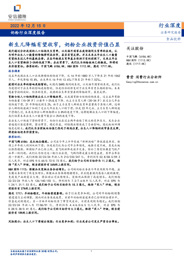 【国证国际】【20221215】20221215-安信国际证券-奶粉行业深度报告:新生儿降幅有望收窄,奶粉企业投资价值凸显-20页