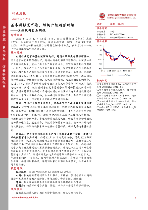 【东亚前海证券】【20221219】20221219-东亚前海证券-食品饮料行业周报:基本面修复可期,结构升级趋势延续-19页