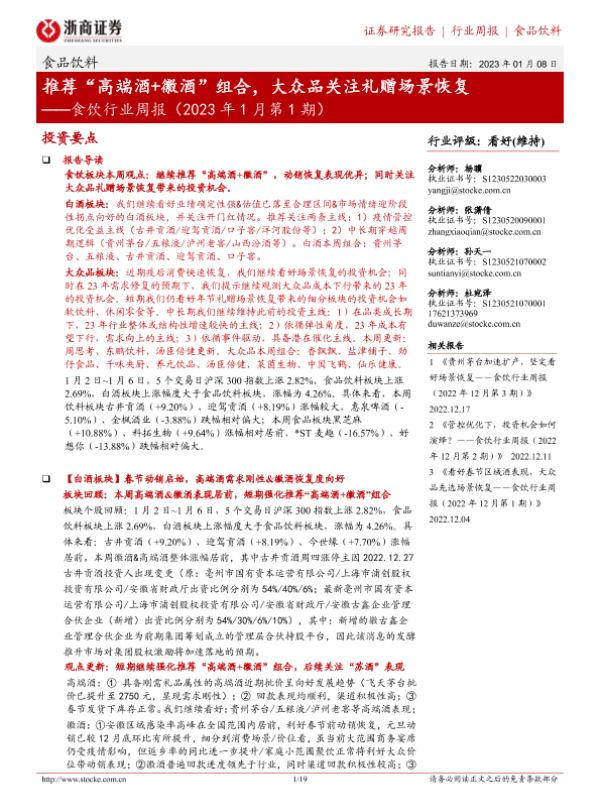 【浙商证券】【20230108】2023年1月第1期食饮行业周报:推荐“高端酒+徽酒”组合,大众品关注礼赠场景恢复-19页