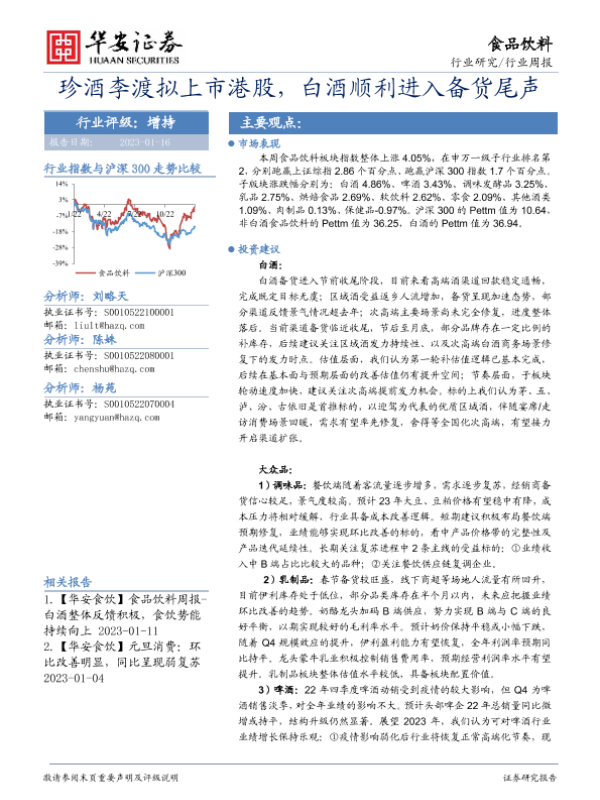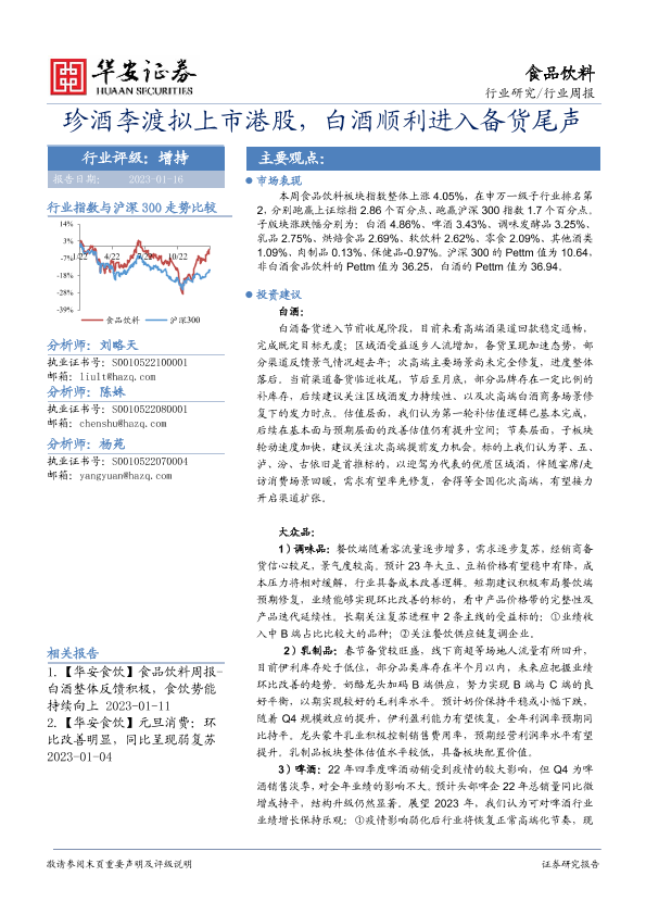 【华安证券】【20230116】20230116-华安证券-食品饮料行业周报:珍酒李渡拟上市港股,白酒顺利进入备货尾声-20页