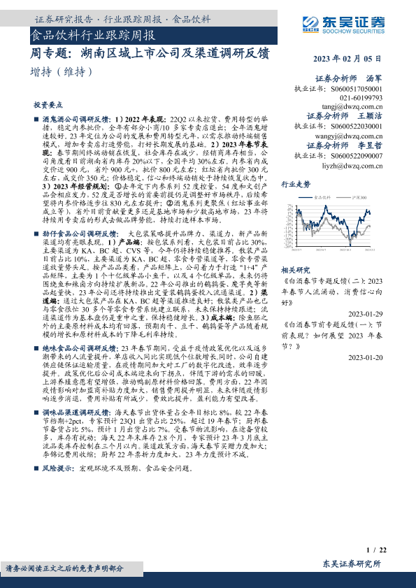 【东吴证券】【20230205】20230205-东吴证券-食品饮料行业跟踪周报:周专题:湖南区域上市公司及渠道调研反馈-22页