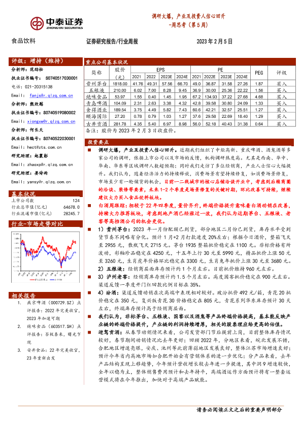 【中泰证券】【20230205】食品饮料行业周思考(第5周):调研火爆,产业及投资人信心回升-11页