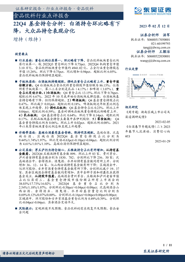 【东吴证券】【20230212】20230212-东吴证券-食品饮料行业点评报告:22Q4基金持仓分析:白酒持仓环比略有下降,大众品持仓表现分化-11页