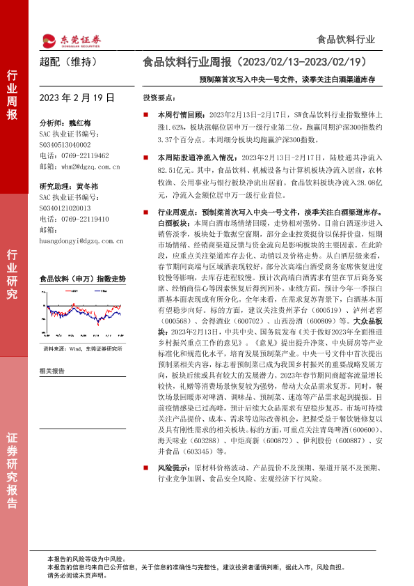 【东莞证券】【20230219】20230219-东莞证券-食品饮料行业周报:预制菜首次写入中央一号文件,淡季关注白酒渠道库存-16页
