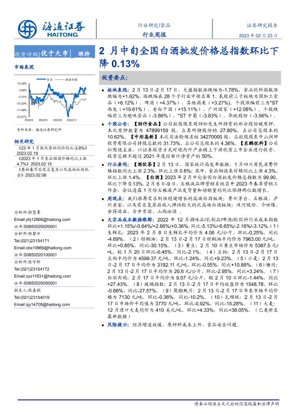 【海通证券】【20230223】20230223-海通证券-食品行业周报:2月中旬全国白酒批发价格总指数环比下降0.13%-16页