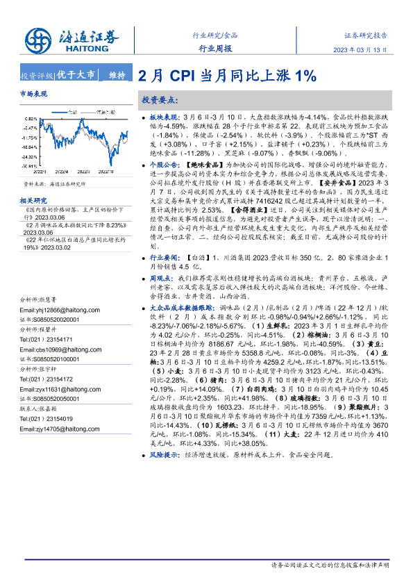 【海通证券】【20230313】20230313-海通证券-食品行业周报:2月CPI当月同比上涨1%-17页