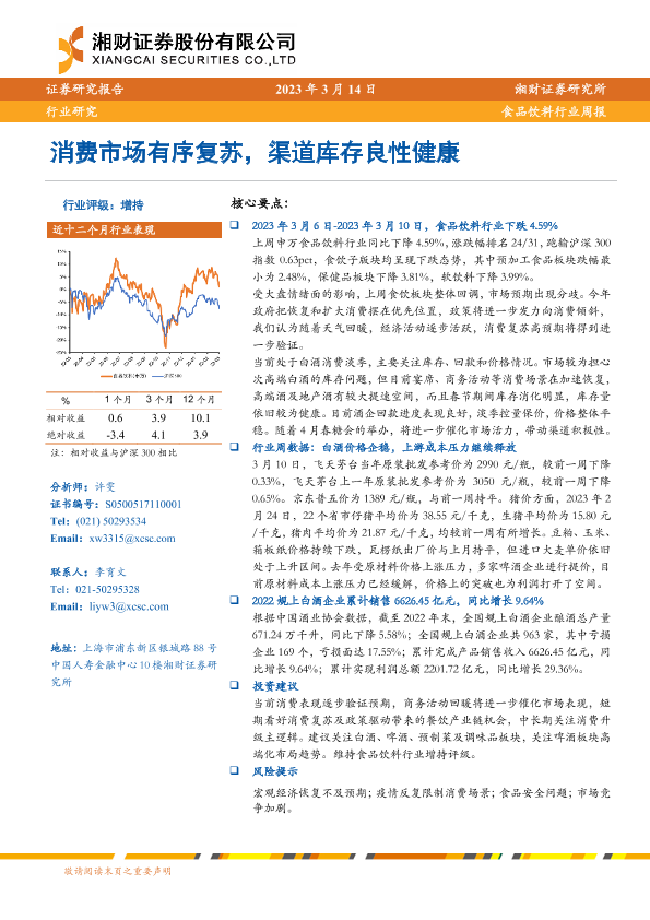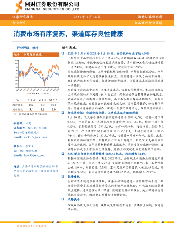 【湘财证券】【20230314】20230314-湘财证券-食品饮料行业周报:消费市场有序复苏,渠道库存良性健康-11页