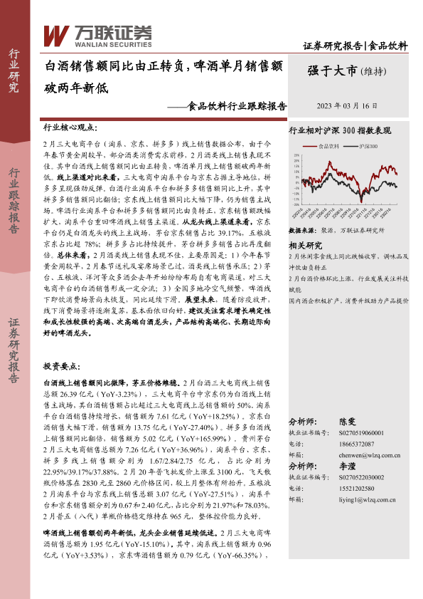 【万联证券】【20230316】食品饮料行业跟踪报告:白酒销售额同比由正转负,啤酒单月销售额破两年新低-12页
