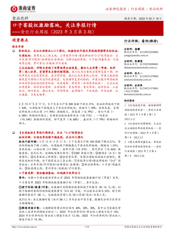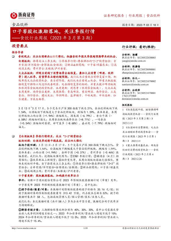 【浙商证券】【20230318】20230318-浙商证券-食饮行业周报(2023年3月第3期):口子窖股权激励落地,关注季报行情-18页