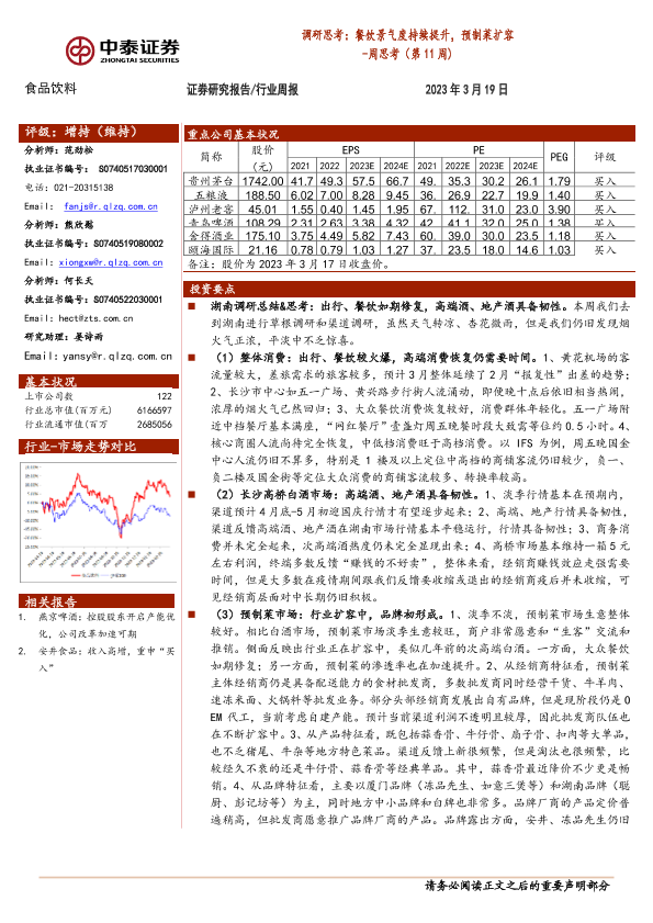 【中泰证券】【20230319】食品饮料周思考(第11周):调研思考:餐饮景气度持续提升,预制菜扩容-10页