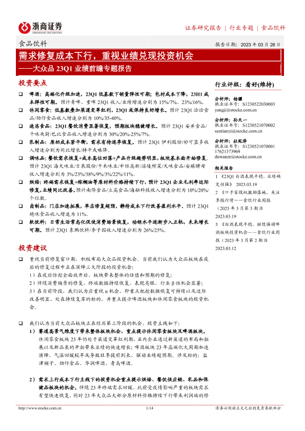 【浙商证券】【20230326】20230326-浙商证券-食品饮料大众品23Q1业绩前瞻专题报告:需求修复成本下行,重视业绩兑现投资机会-14页