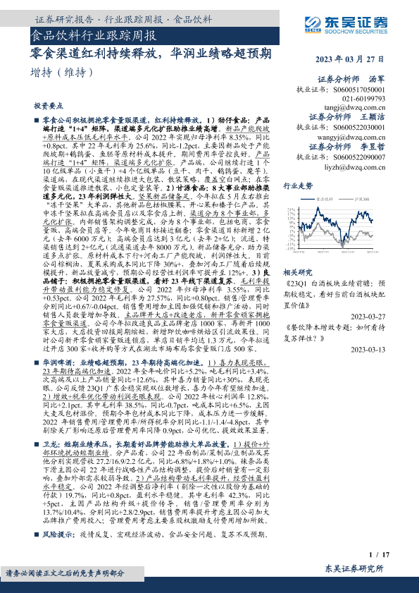 【东吴证券】【20230327】食品饮料行业跟踪周报:零食渠道红利持续释放,华润业绩略超预期-17页