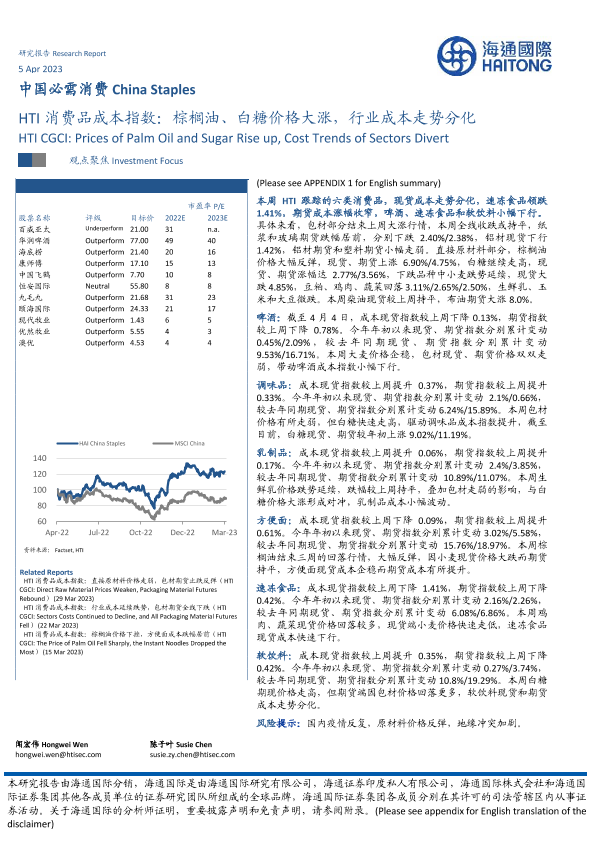 【海通国际】【20230405】HTI消费品成本指数:棕榈油、白糖价格大涨,行业成本走势分化-16页