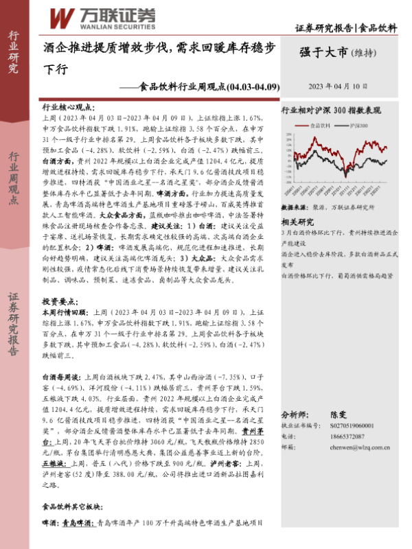 【万联证券】【20230410】20230410-万联证券-食品饮料行业周观点:酒企推进提质增效步伐,需求回暖库存稳步下行-13页