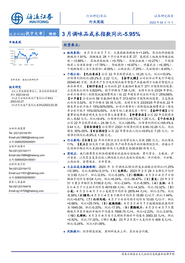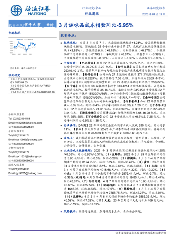 【海通证券】【20230411】20230411-海通证券-食品行业周报:3月调味品成本指数同比-5.95%-17页