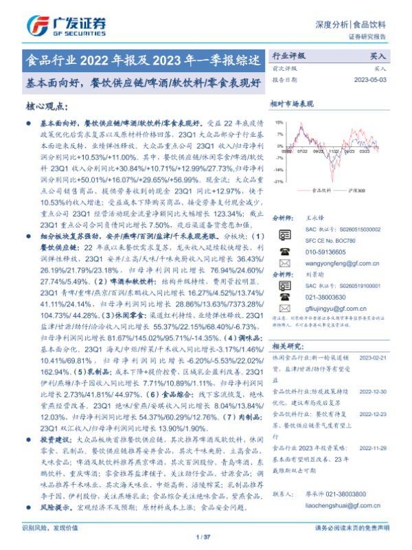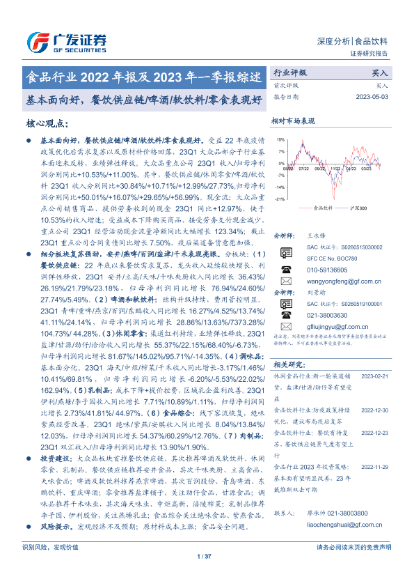 【广发证券】【20230503】食品行业2022年报及2023年一季报综述:基本面向好,餐饮供应链 啤酒 软饮料 零食表现好-37页