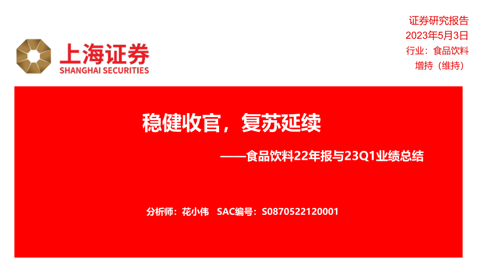 【上海证券】【20230503】食品饮料22年报与23Q1业绩总结:稳健收官,复苏延续-17页