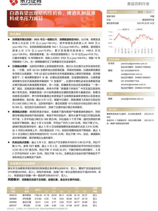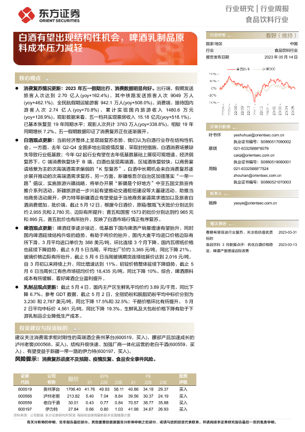 【东方证券】【20230514】20230514-东方证券-食品饮料行业行业周报:白酒有望出现结构性机会,啤酒乳制品原料成本压力减轻-10页