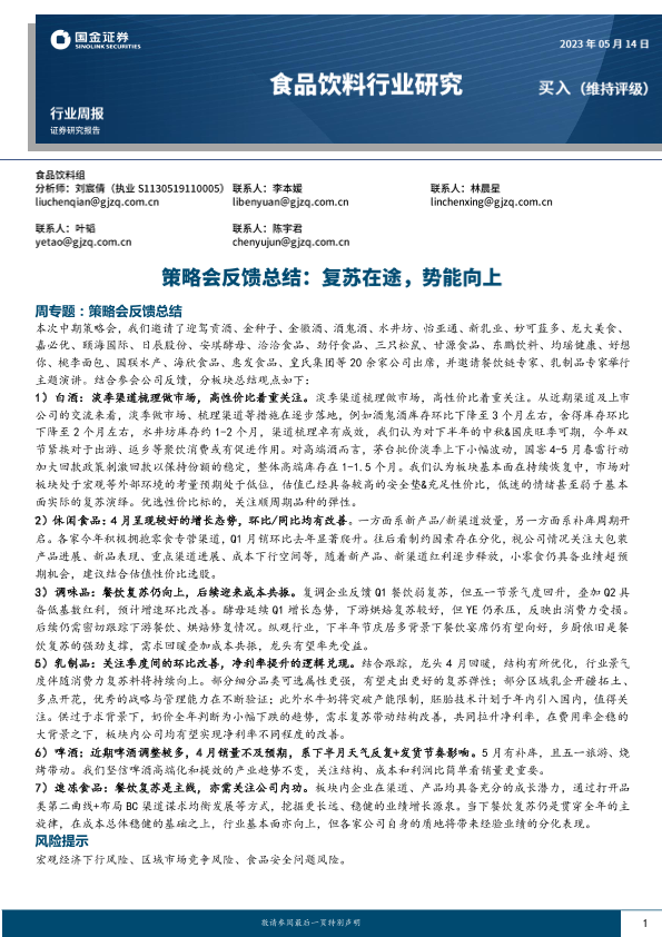 【国金证券】【20230514】20230514-国金证券-食品饮料行业研究:策略会反馈总结:复苏在途,势能向上-13页