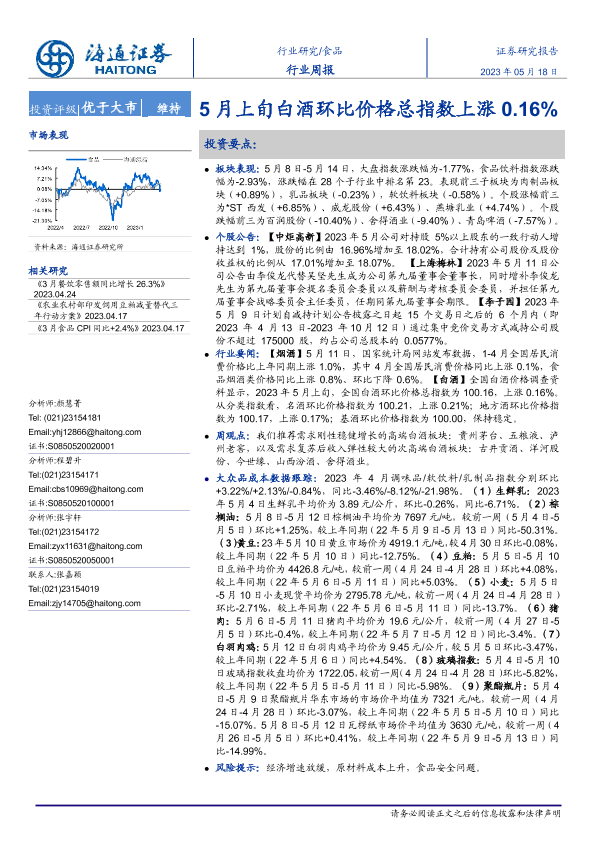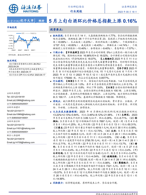 【海通证券】【20230518】20230518-海通证券-食品行业周报:5月上旬白酒环比价格总指数上涨0.16%-16页
