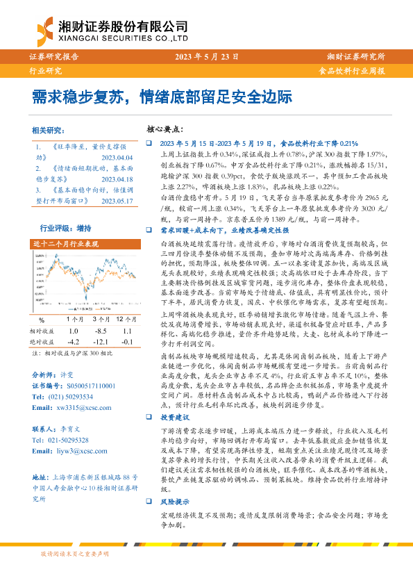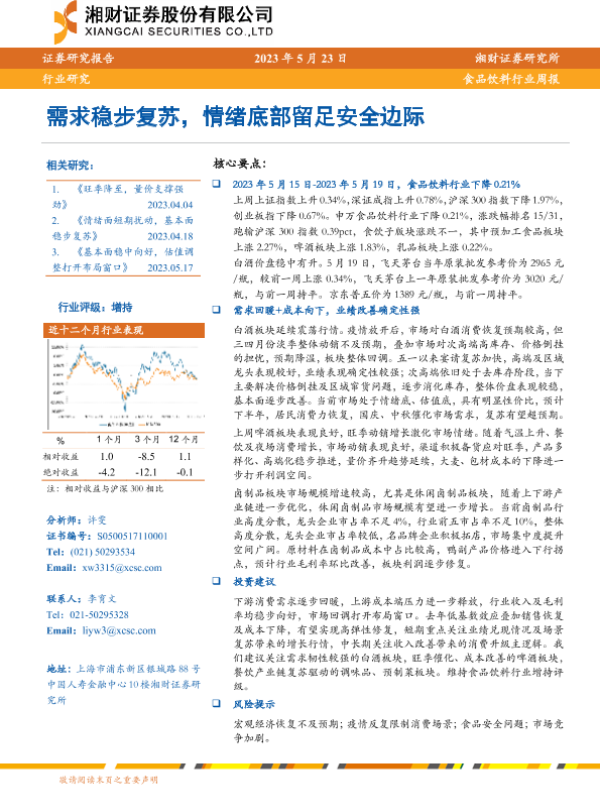 【湘财证券】【20230523】20230523-湘财证券-食品饮料行业周报:需求稳步复苏,情绪底部留足安全边际-11页