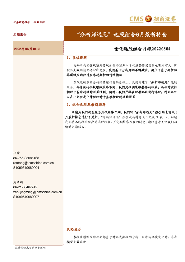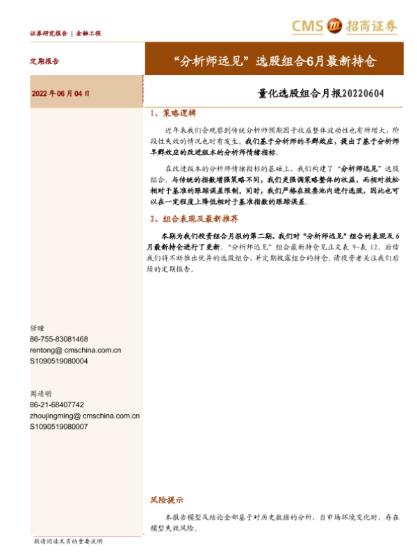 【海通证券】【20220604】量化选股组合月报:“分析师远见”选股组合6月最新持仓-17页