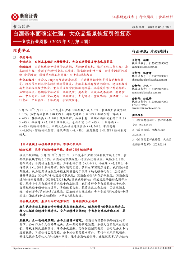 【浙商证券】【20230528】食饮行业周报(2023年5月第4期):白酒基本面确定性强,大众品场景恢复引领复苏-19页