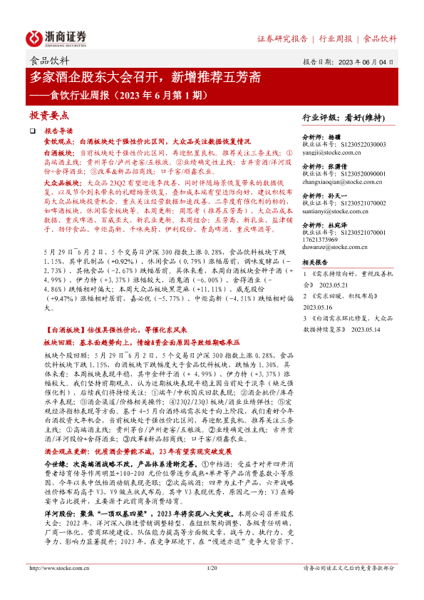 【浙商证券】【20230604】食饮行业周报(2023年6月第1期):多家酒企股东大会召开,新增推荐五芳斋-20页
