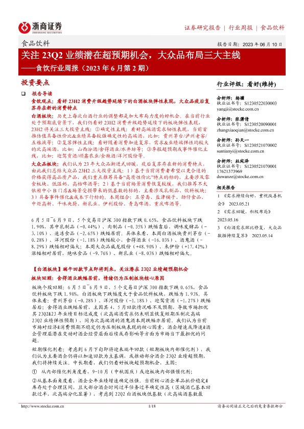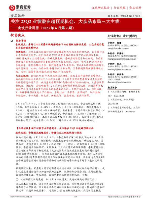 【浙商证券】【20230610】食饮行业周报(2023年6月第2期):关注23Q2业绩潜在超预期机会,大众品布局三大主线-18页