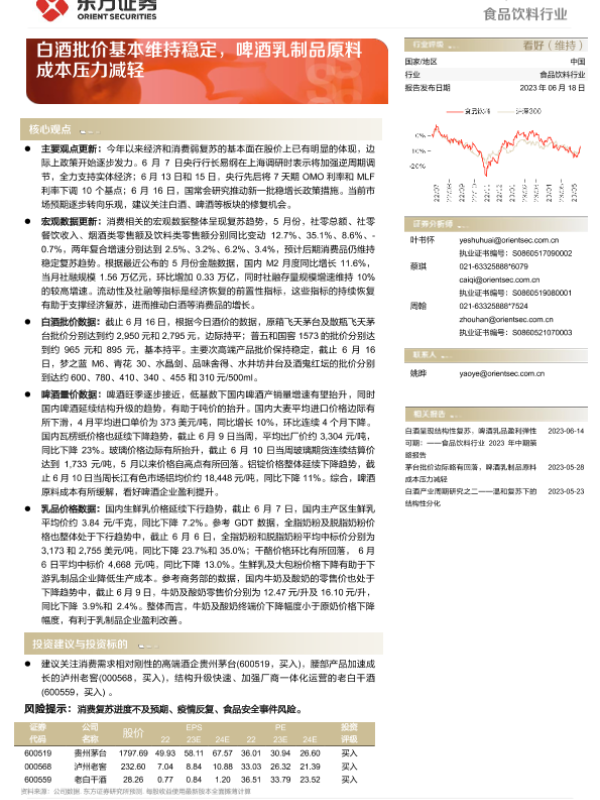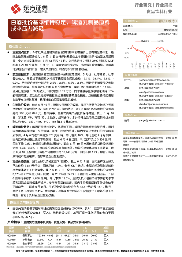 【东方证券】【20230618】食品饮料行业周报:白酒批价基本维持稳定,啤酒乳制品原料成本压力减轻-10页