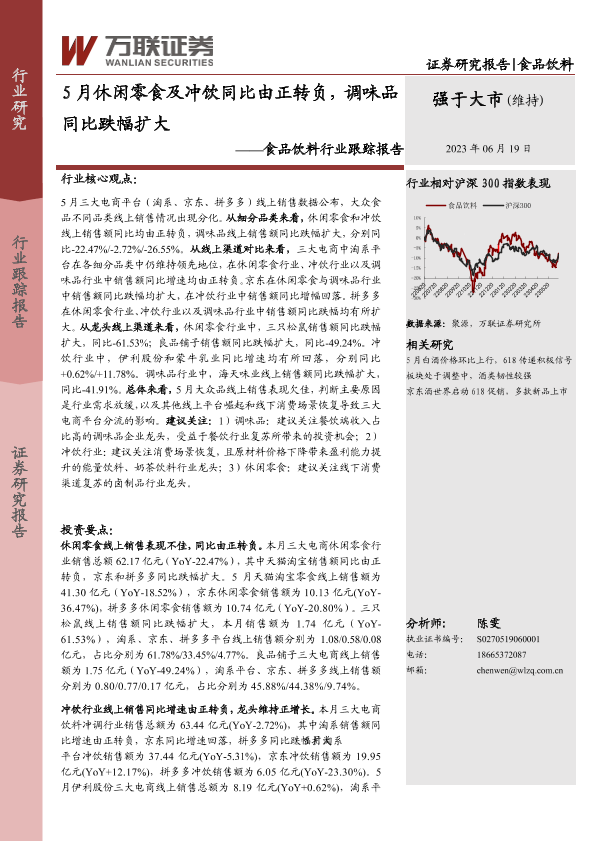 【万联证券】【20230619】20230619-万联证券-食品饮料行业跟踪报告:5月休闲零食及冲饮同比由正转负,调味品同比跌幅扩大-13页
