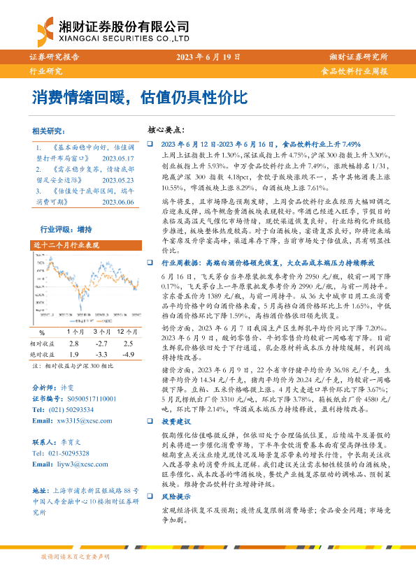 【湘财证券】【20230619】20230619-湘财证券-食品饮料行业周报:消费情绪回暖,估值仍具性价比-10页