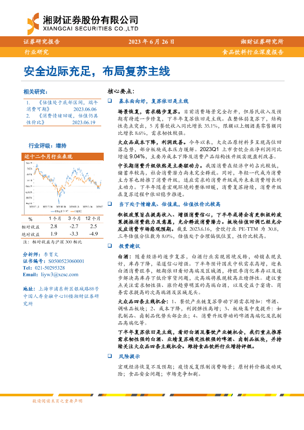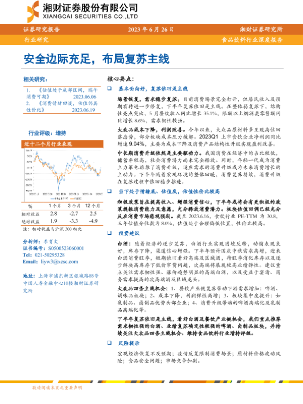 【湘财证券】【20230626】20230626-湘财证券-食品饮料行业深度报告:安全边际充足,布局复苏主线-27页